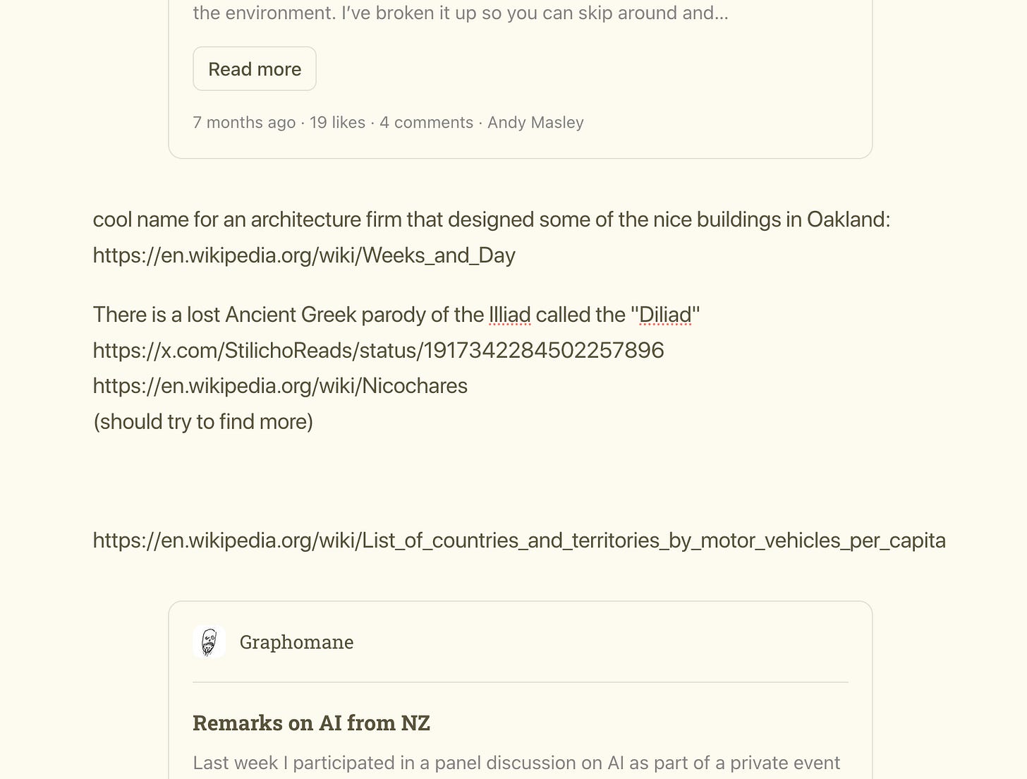 A meta reflection: I feel I’m kinda bad at making these list posts. I read a lot of stuff, but only very occasionally do I remember to paste the link in here. When I do, it contributes to a growing messy list of raw links that initially looks like this: