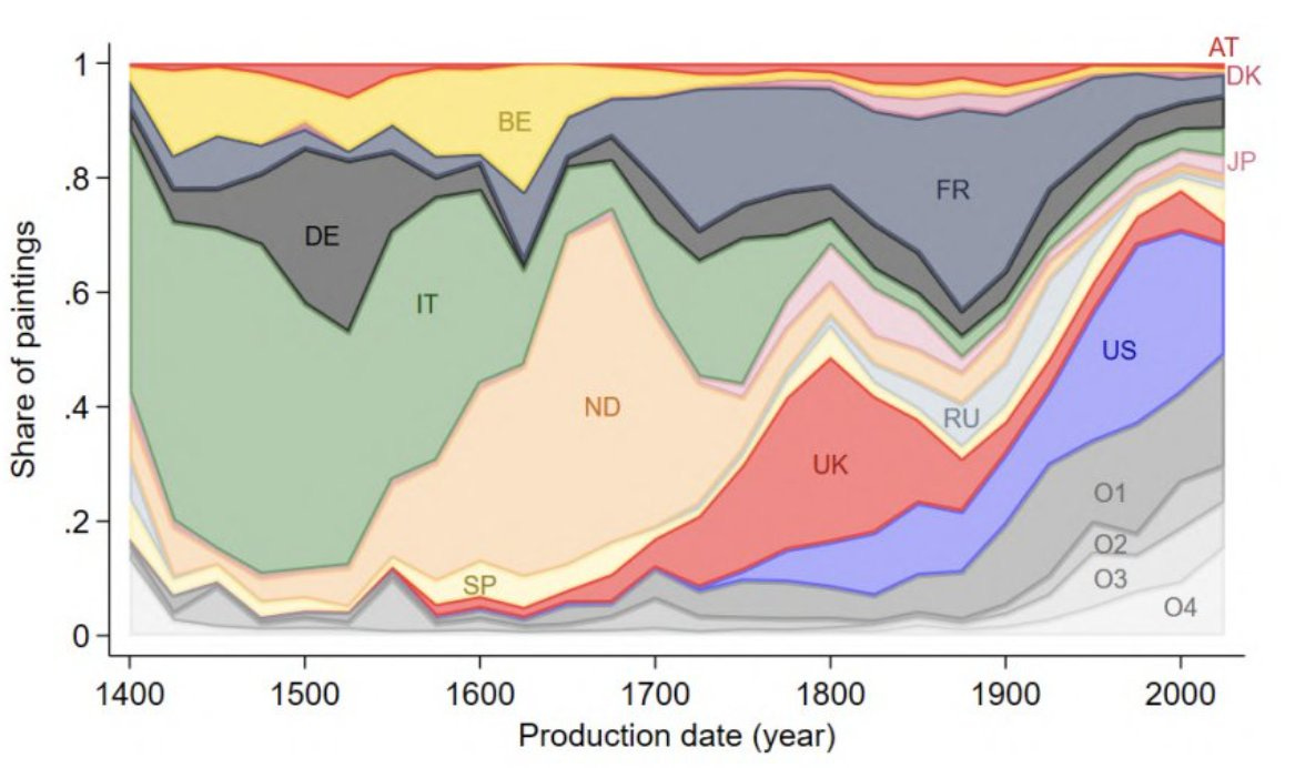Cool economics paper answering various questions about notable paintings, including this chart by country, which seems like a decent proxy for relative cultural power over time: