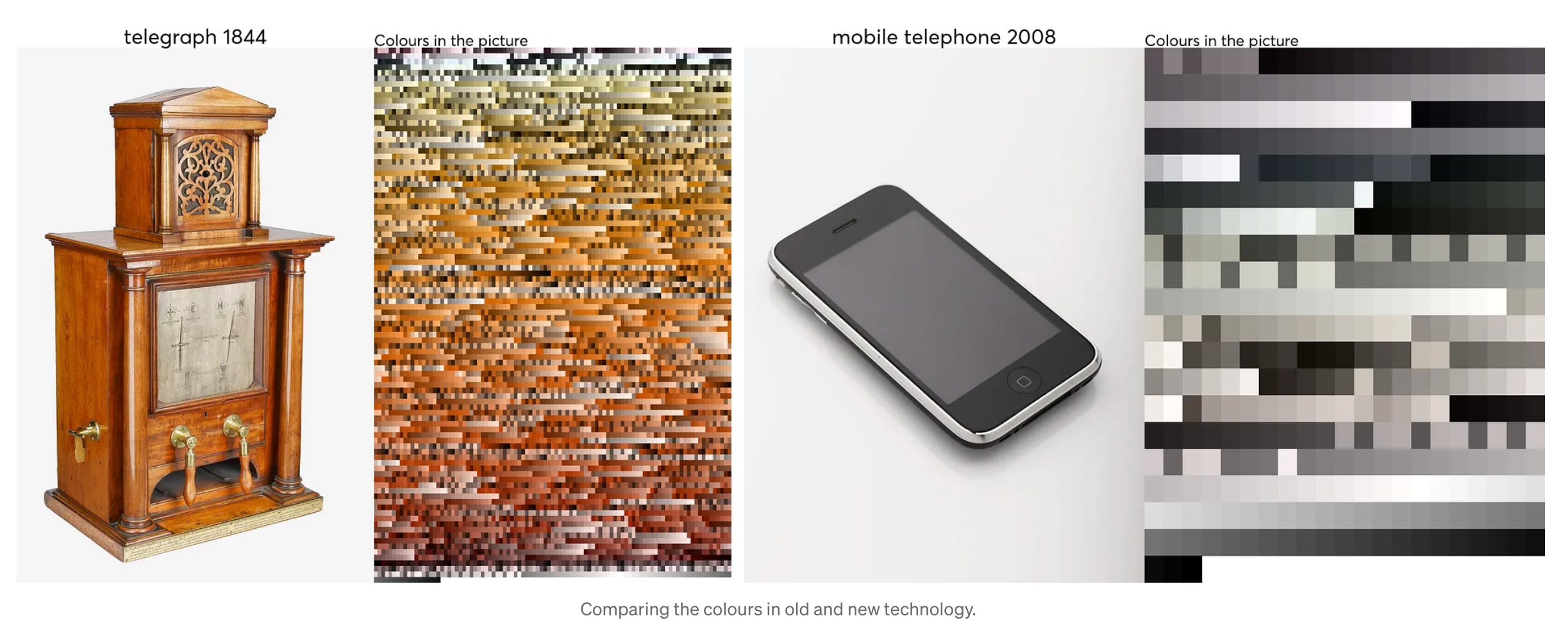 What people seem to never mention is that it comes from this article, a really cool account of how the Science Museum Group people in the UK collected the data, by analyzing the pixels in standardized photos of museum artifacts. This lack of source attribution often leads to commenters making fools of themselves by pointing out that color photography wasn’t around in the 19th century, which is totally irrelevant since all the photos are recent.