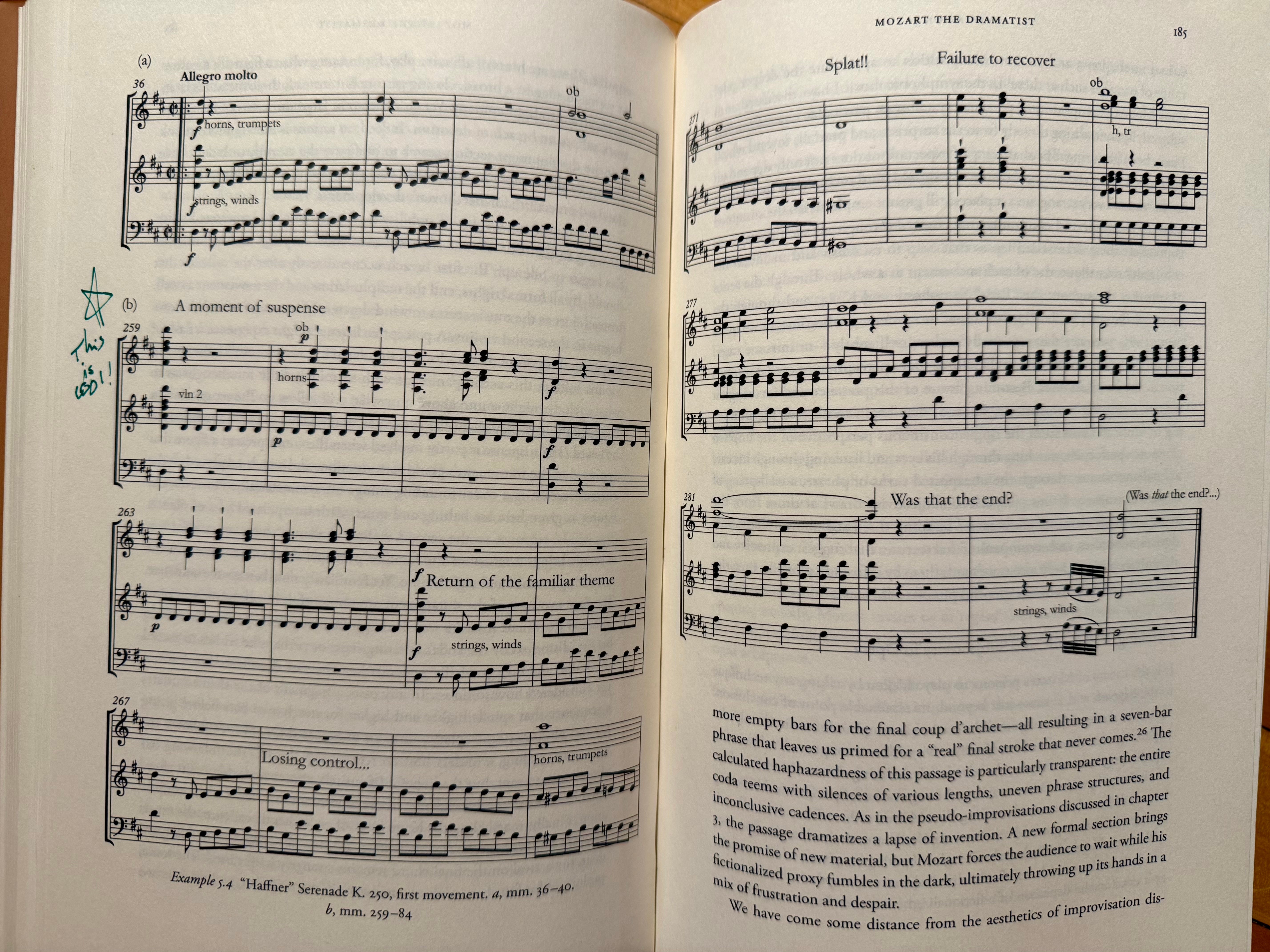 But when I succeeded, it made the experience of reading the book much deeper, and it acquainted me with many tidbits of the Mozartian oeuvre that I didn’t know. My favorite moment — which also contains my favorite quote from the book — was the analysis of the “Haffner” Serenade K. 250, first movement, in Mozart the Dramatist. The nearly two-page sheet music example is annotated with an interpretation of what the music at the end of the movement might be intended to convey: after a very normal 9 minutes of music, we understand that “the ostentatious display of stability is, it turns out, the protracted setup for a gag in the coda.” The last few moments of the piece are an accumulation of surprises: a cadence that isn’t the end, an uncertain moment of suspense, a return of the main theme that immediately seems to lose control, an unexpected ending. And my favorite quote is this single word, used to describe a surprising G♯: “Splat!!”