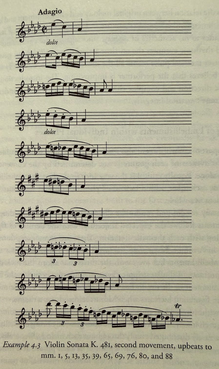 The reason is that the book relies on lots of examples, and the examples only work if you can hear the music. A highly skilled musician might be able to sight-read the printed examples and hear the music in his mind’s ear. Another might be so well versed in Mozart that she sees “Violin Sonata K. 481” and immediately knows what Dorian is talking about. I am neither of these. I can sing from memory only a few of the most famous Mozart classics: Eine kleine Nachtmusik, the Rondo alla Turca, the Queen of the Night aria from Die Zauberflöte, the Andante of the Piano Concerto No. 21, the Dies Irae from the Requiem. For everything else, the text did very little for me if I didn’t put in the effort required to breathe life into the patterns of dots.
