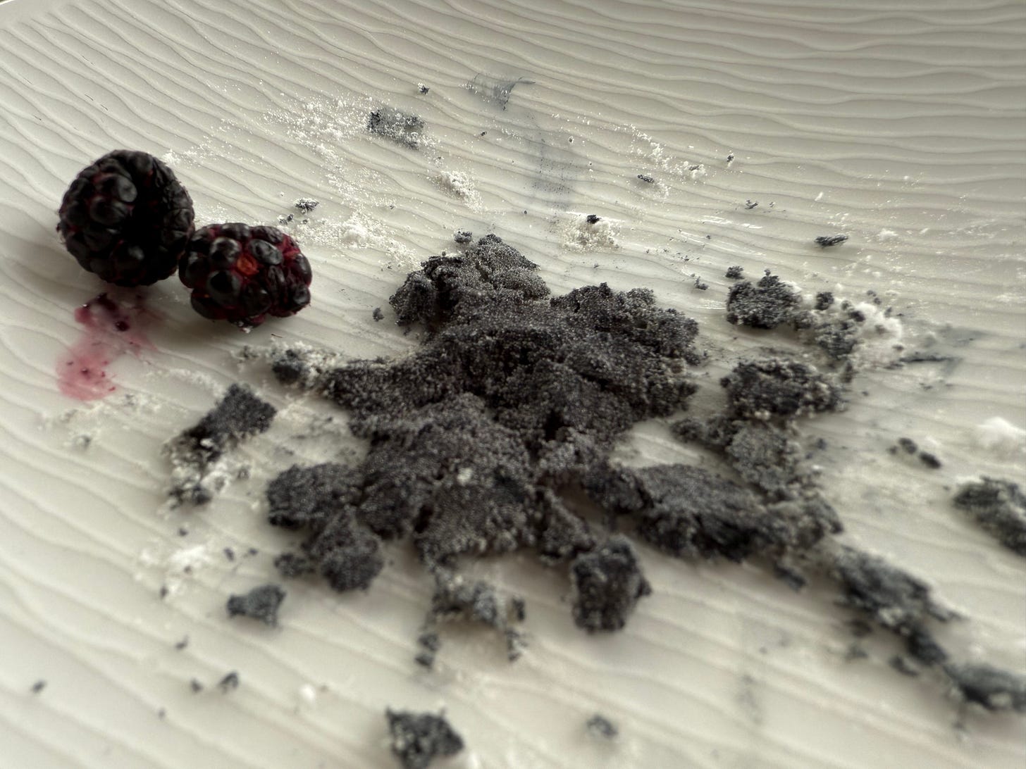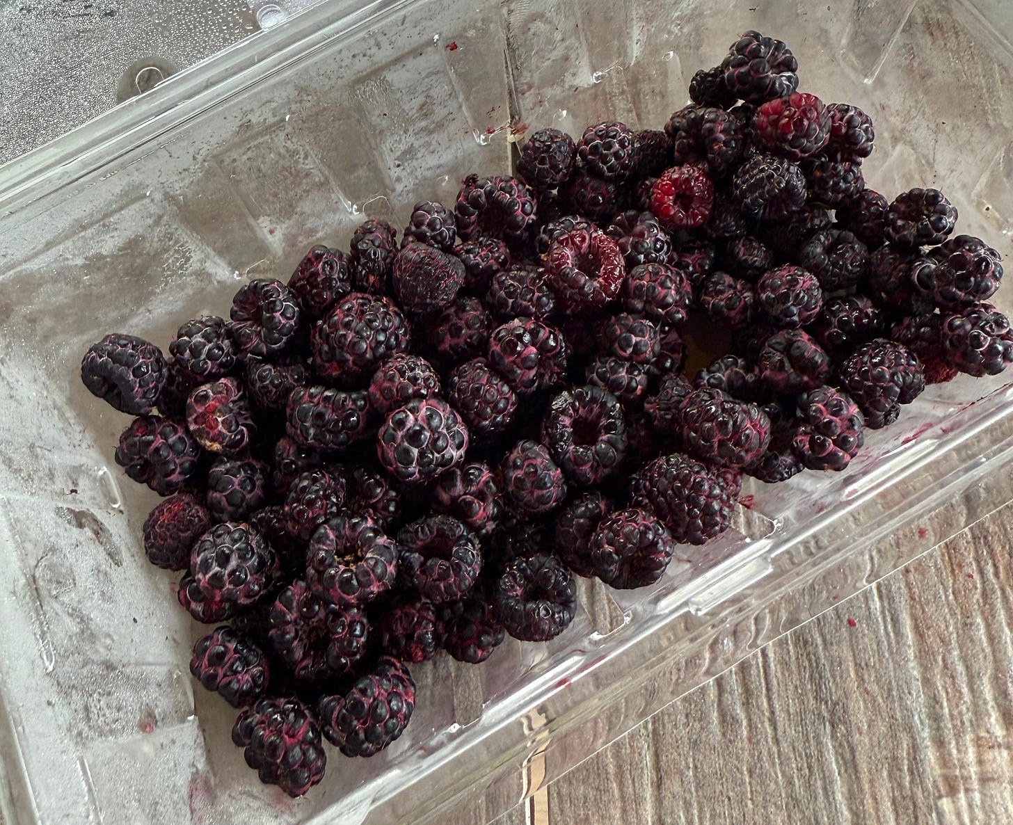 Last year in July I bought some black raspberries (presumably R. occidentalis, based on appearance, location, and the fact that I donât think other types of black raspberries are cultivated commercially) from the Jean-Talon Market in Montreal. I thought they tasted somewhat like blue raspberry flavor, and decidedly different from red raspberries, so I thought it would be cool to perform a taste test to compare them with blue raspberry candy, and then write a post about it. So I went back to the market, where I was told that the black raspberry season was over. It apparently lasts for 3 days or something. So I put a big alert saying BLACK RASPBERRIES in my calendar for a year minus a week later, 12 July 2025. Because I was traveling to see my parents on 12 July this year, I went to the market on 11 July, just in case. Where I was promptly told that the season was already over!!! I guess raspberry season was early this year. Luckily, for some reason they still had two boxes hidden behind the counter, and they agreed to sell me one for $5.