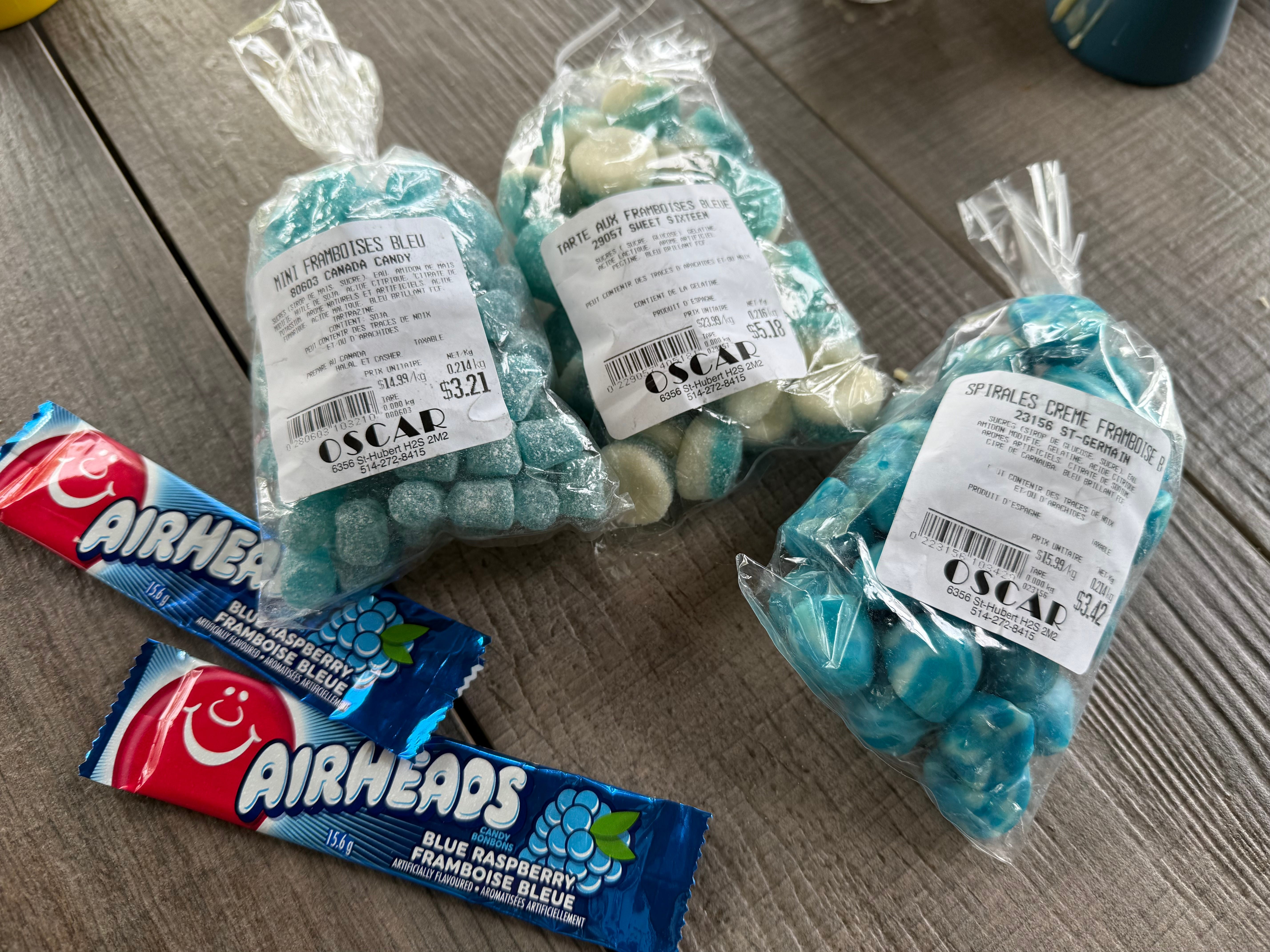 I also bought some locally grown red raspberries for comparison purposes, and then I went to a candy store and asked the clerk to show me everything that was labeled as âblue raspberry.â She said that âanything that is blue is blue raspberryâ (and then showed me a random example that turned out to be blueberry). For rigor, I decided that Iâd only buy candy that was explicitly labeled as âframboise bleue.â I got these four kinds: