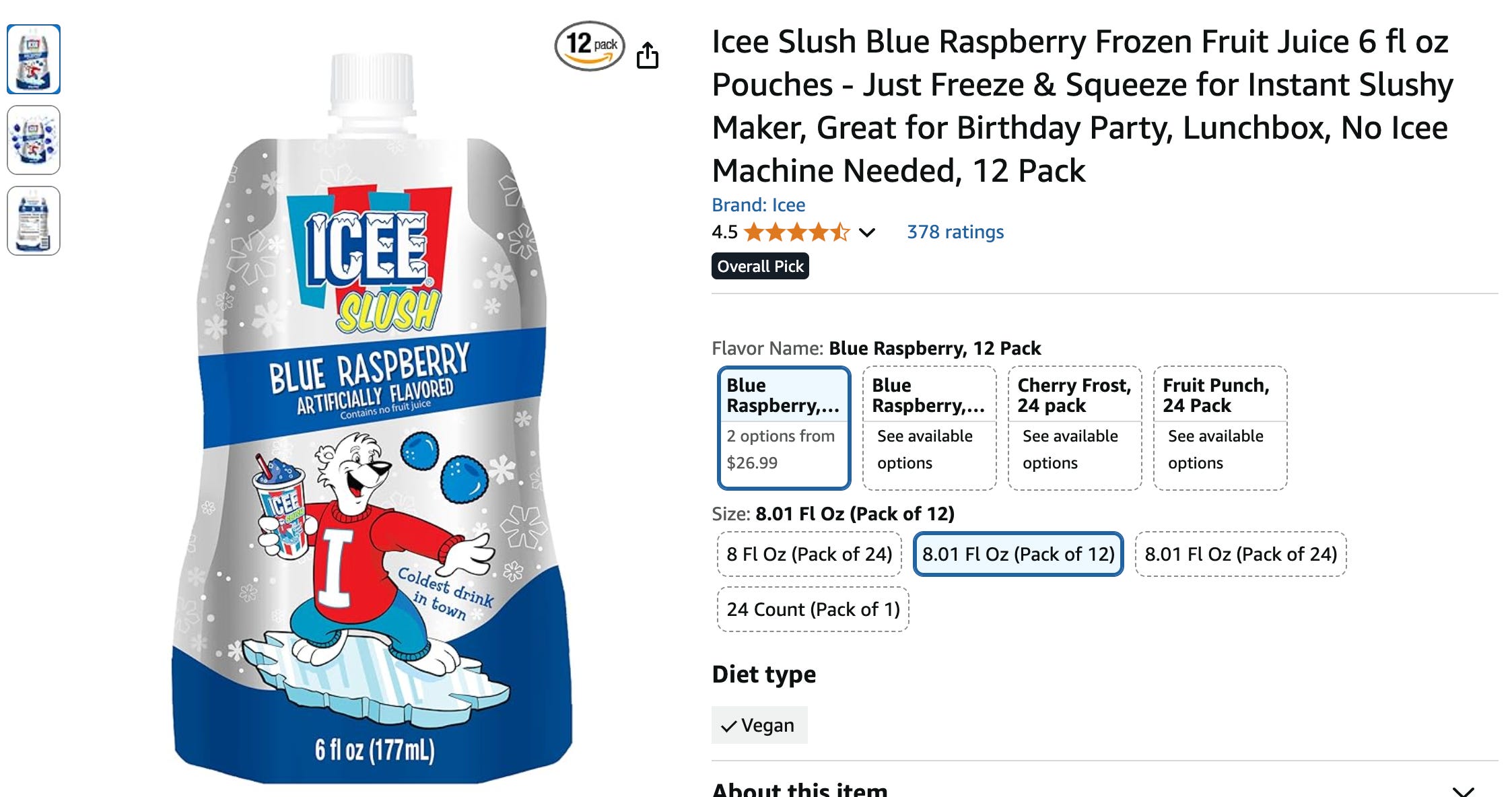 The flavor was further popularized around 1971 by The ICEE Company for frozen slushie drinks. The other flagship color of ICEE was cherry, so apparently they wanted a distinct color for their raspberry product, and one that would match the ICEE logo. Besides, FD&C Blue No. 1 had conveniently just become approved by the FDA.