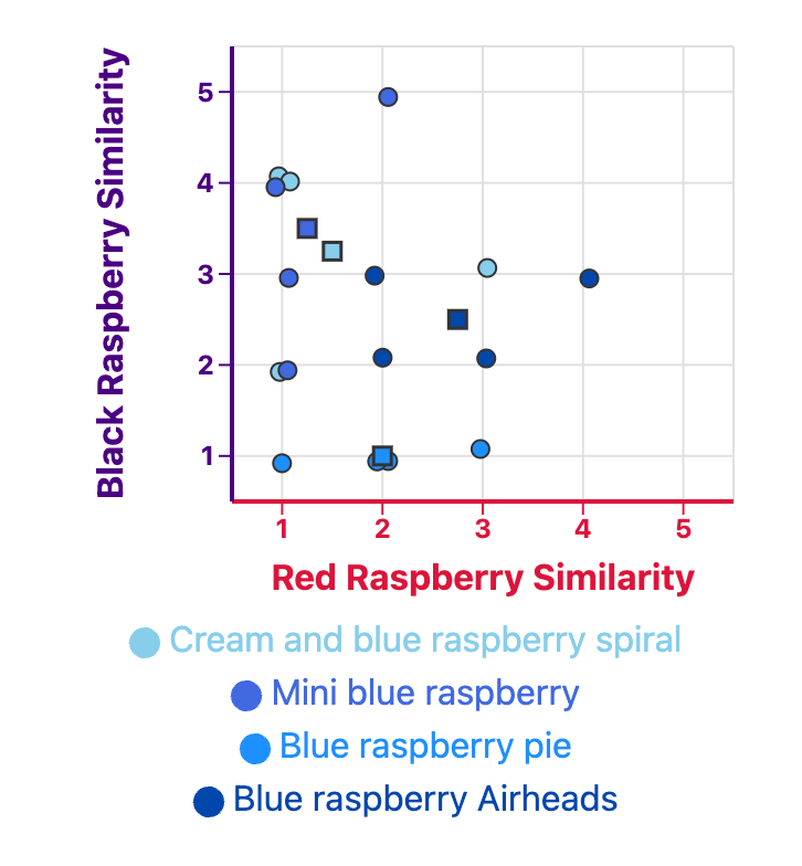 The results donât really support this. There may be an association, but itâs a weak one, whereas I was hoping for something obvious. When I had black raspberries in isolation, it was easy for me to think that this was totally the same as blue raspberry flavor. But none of the other tasters was particularly convinced. I asked them if they thought, in light of the test, whether it was plausible that black raspberries inspired blue raspberry; the three of them said no, not really. (I didnât ask my nephews.)