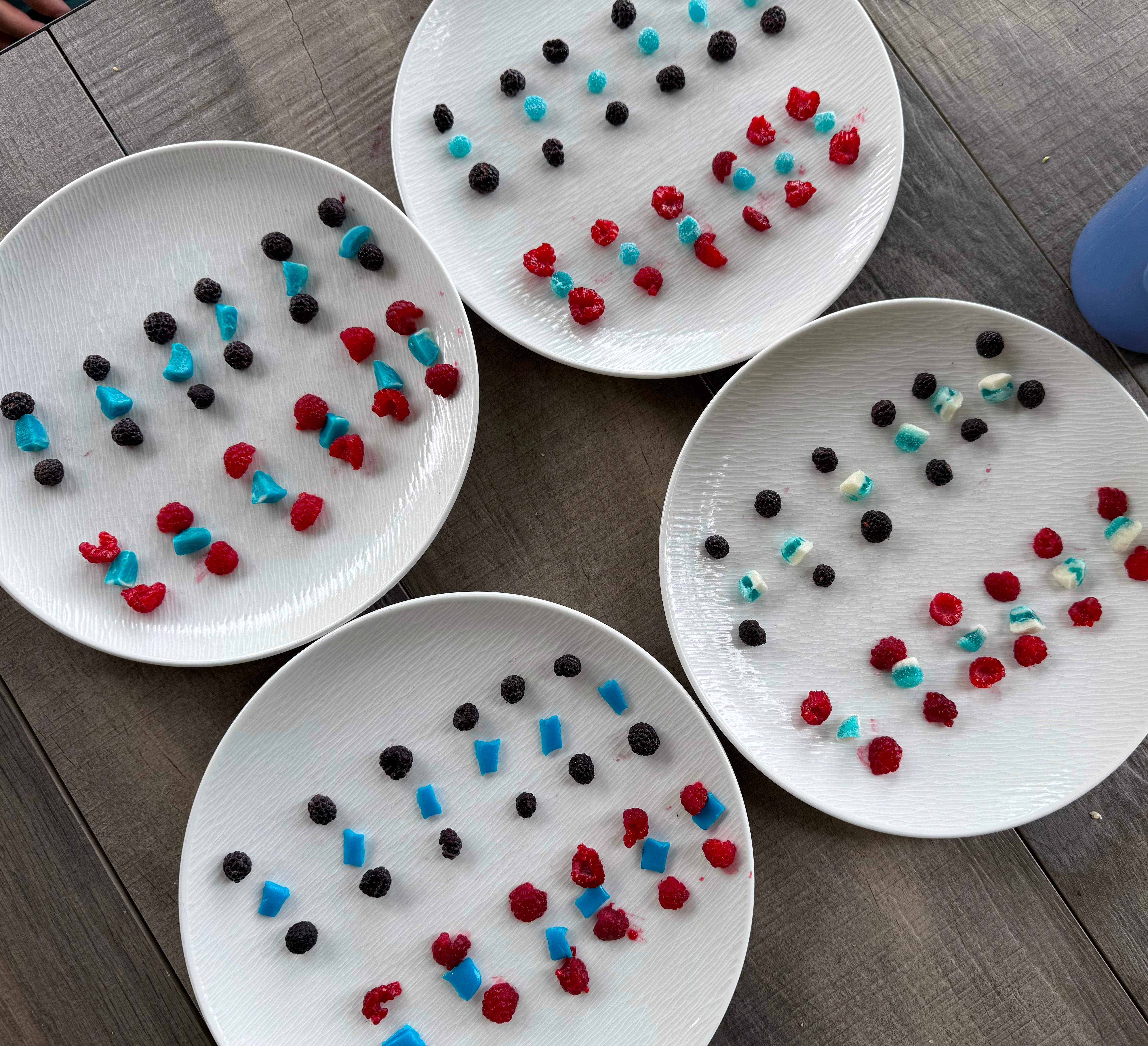 I then traveled to my parentsâ home and recruited a representative sample of tasters from the people in the area (myself, my mom, my dad, my brother, my sister-in-law, and my 5-year-old and almost-4-year-old nephews). I cut small pieces of each candy and arranged them like this, the idea being that everyone would try a raspberry, then the candy, then have the raspberry again, and do this for each combination or red/black raspberry and candy type.