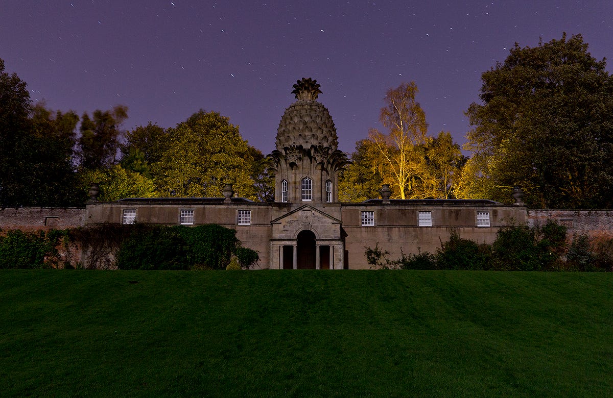 Take something that started out as extremely rare and expensive. Pineapples, say. Exotic, striking in appearance, tasty — and extremely difficult to grow in 17th- and 18th-century Europe. Aristocrats loved pineapples. Wikipedia says that “they were initially used mainly for display at dinner parties, rather than being eaten, and were used again and again until they began to rot.” Rich people even used pineapples as a motif for architectural ornamentation, sometimes to absurd proportions: