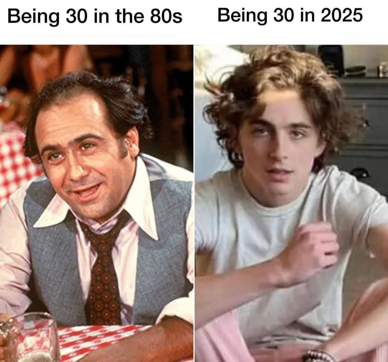 This is different from the typical definition of “middle age”, which usually refers to the period from 40 to either 60 or 65, but the elegance of the three thirds is attractive. (Also, if the middle age starts at 40, what are you at 39? A young adult? Come on.) The problem with this theory that it doesn’t really work. Maybe it did in the past, back when most people at 30 would be expected to already have a career, a spouse, and at least one kid, and when the left half of this meme was true:
