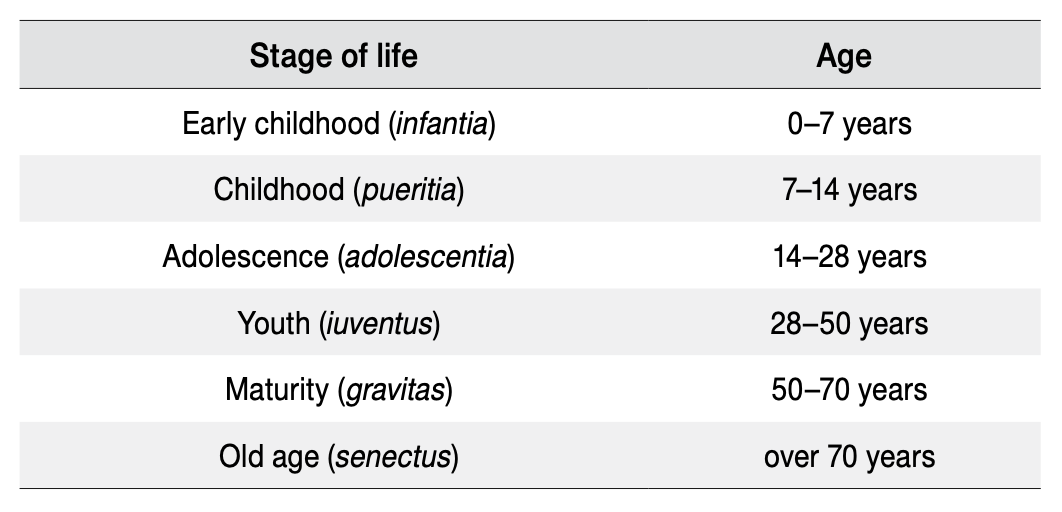 According to this, I’m still in the first half of iuventus, youth. I’m very okay with that. Also notable is the pretty long adolescentia, until 28 years old, which doesn’t feel out of place in the 21st century at all. In fact the whole table feels surprisingly modern, and makes me question the received wisdom that adolescence is a recent invention or whatever.2