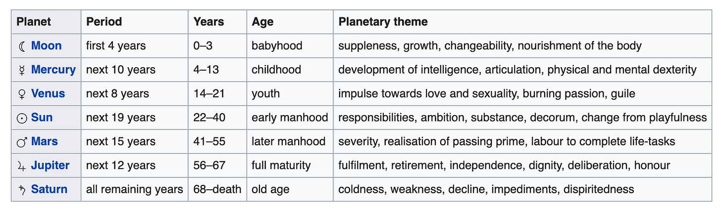According to this I’m in the Sun phase, full of responsibilities, ambition, and decorum. Sure. The middle age according to the modern definition is associated with Mars, which sounds combative and difficult.