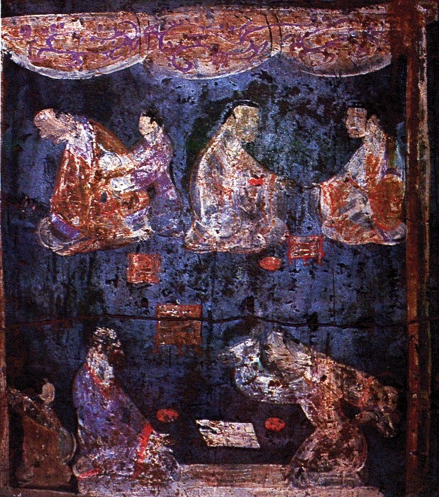 In another cradle of civilization, a very similar story unfolded from about 800 BC. So similar, in fact, that it has been speculated that knowledge of Egyptian blue spread along the early silk road, all the way to China, where Han blue (together with Han purple) makes an appearance during the Zhou dynasty. Han blue has almost the same chemical formula as Egyptian blue, but replaces calcium with barium: BaCuSi4O10. It may also have been an independent invention, perhaps the work of Taoist alchemists and glassmakers. Its use declined after the Han dynasty, and few examples survive.