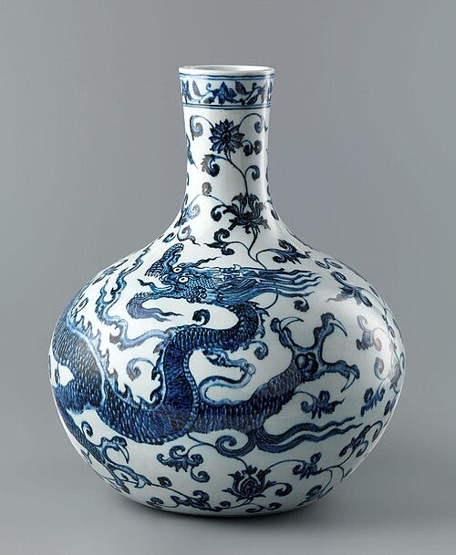 Much later, China would become famous for another application of blue: the “blue and white” porcelain style. The blue here comes from cobalt oxide, which had colored Egyptian faience since at least 1500 BC, though nobody at the time knew what cobalt was. You could make cobalt blue in the form of glass and then grind it into a pigment called smalt. Despite porcelain originating in China, it seems that the use of smalt for the blue and white style began in Iraq. It spread from the Middle East to China, and then from China to the rest of the world including Europe, would eventually allow Swedish chemist Georg Brandt to identify cobalt as an element in 1735, the first time a new metal was discovered since antiquity.3
