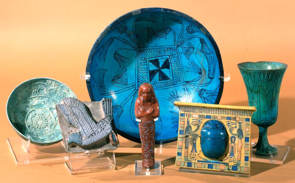Azurite would later enjoy a fruitful career as the main blue pigment in European painting, but to the Egyptians it was costly, and besides it isn’t the most stable blue color: it degrades and fades when in contact with air. And so they created the first synthetic pigment in history: Egyptian blue. The oldest evidence of it is in a bowl dated to 3250 BC. Egyptian blue is a calcium copper silicate with formula CaCuSi4O10 or CaOCuO(SiO2)4. Its method of manufacturing, in a rare example of lost technology, was forgotten towards the end of antiquity, but has been plausibly reconstructed. It likely involved heating together quartz sand (silica) and some source of copper (either copper ores or scraps from the bronze industry), together with an alkali (like natron) and a calcium oxide (unintentionally added as impurities in the other materials).